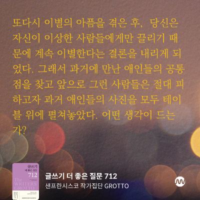 애인들은 아니었고 내가 좋아해서 그냥 잠시 스쳐 만나게 된 사람들의 공통점을 보니 일단 그놈의 비주얼을 따진듯... 그러니 흐지부지, 사귄것도 아니고 참.. 어이없는 관계들이었다. 고로 깊은 빡침과 깨달음을 그들을 통해서 뼈저리게 느꼈다. 일단 나에게 문제가 있었던 것을 먼저 시인할 수 밖에 없었다. 남녀 관계를 너무 쉽게 본 것, 정말 나의 인연을 찾을려고 했으면 쿨한척 하는 가벼운 사람이 아니라 정성과 따뜻함을 보여야 했었다는 것. 상처를 덜 받으려고 너무 가볍게 생각했었다. 그런데 많은 세월이 지나 생각해보니 그 사람들한테는 아버지의 싫어했던 모습이 없었는데, 그런 모습을 발견할 정도로 만남이 길었던 것이 아니었으니 오히려 잘된? 일인가... 모순된 양가 감정속에서 어떤게 내 본심인지 나조차도 헷갈리는 상황이다. 일단 평생 인연을 만나서 나름 잘 살고 있으니 다행으로 생각하자. 오늘 결말이 있는 질문은 그래도 해피엔딩이라 만족.