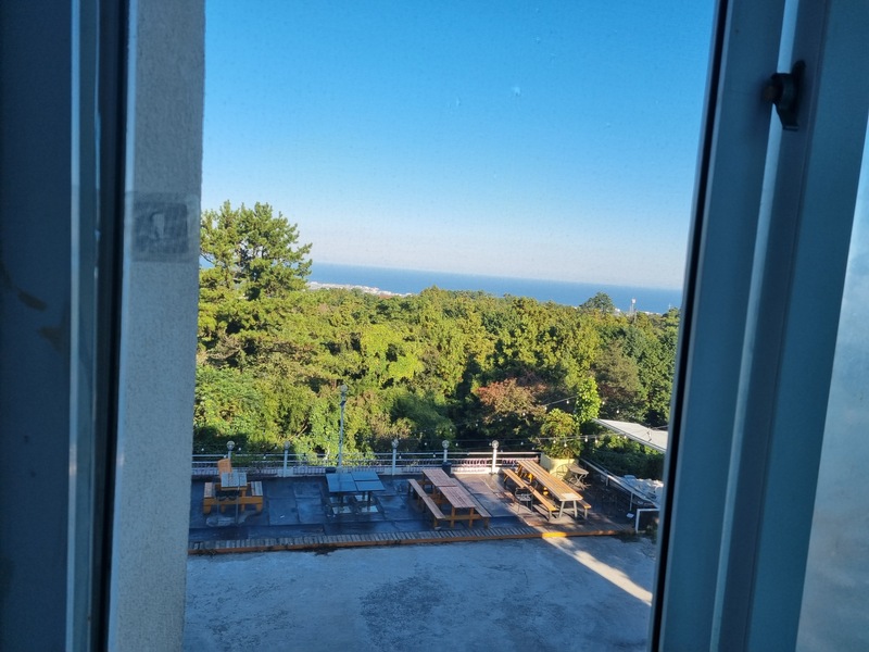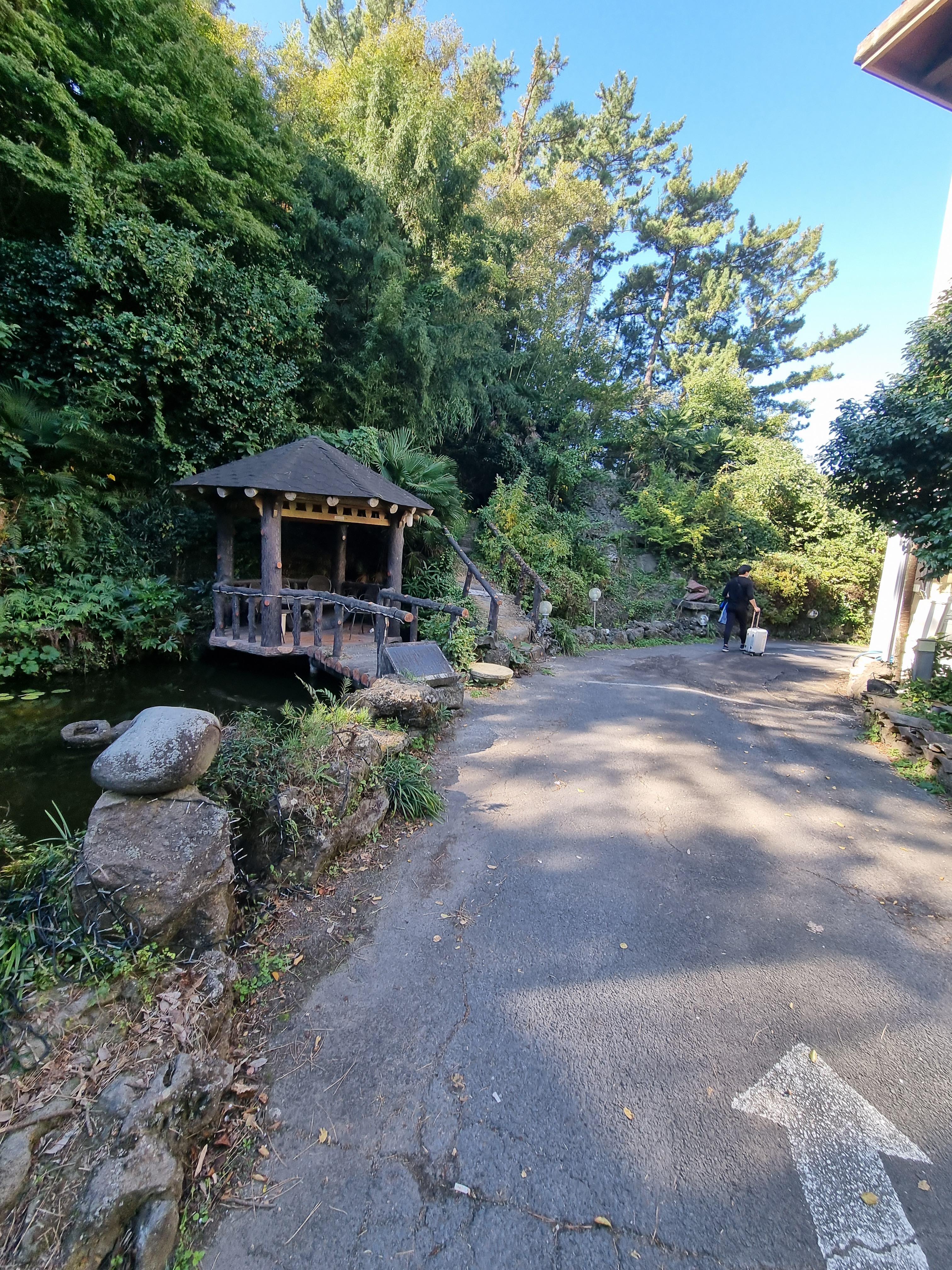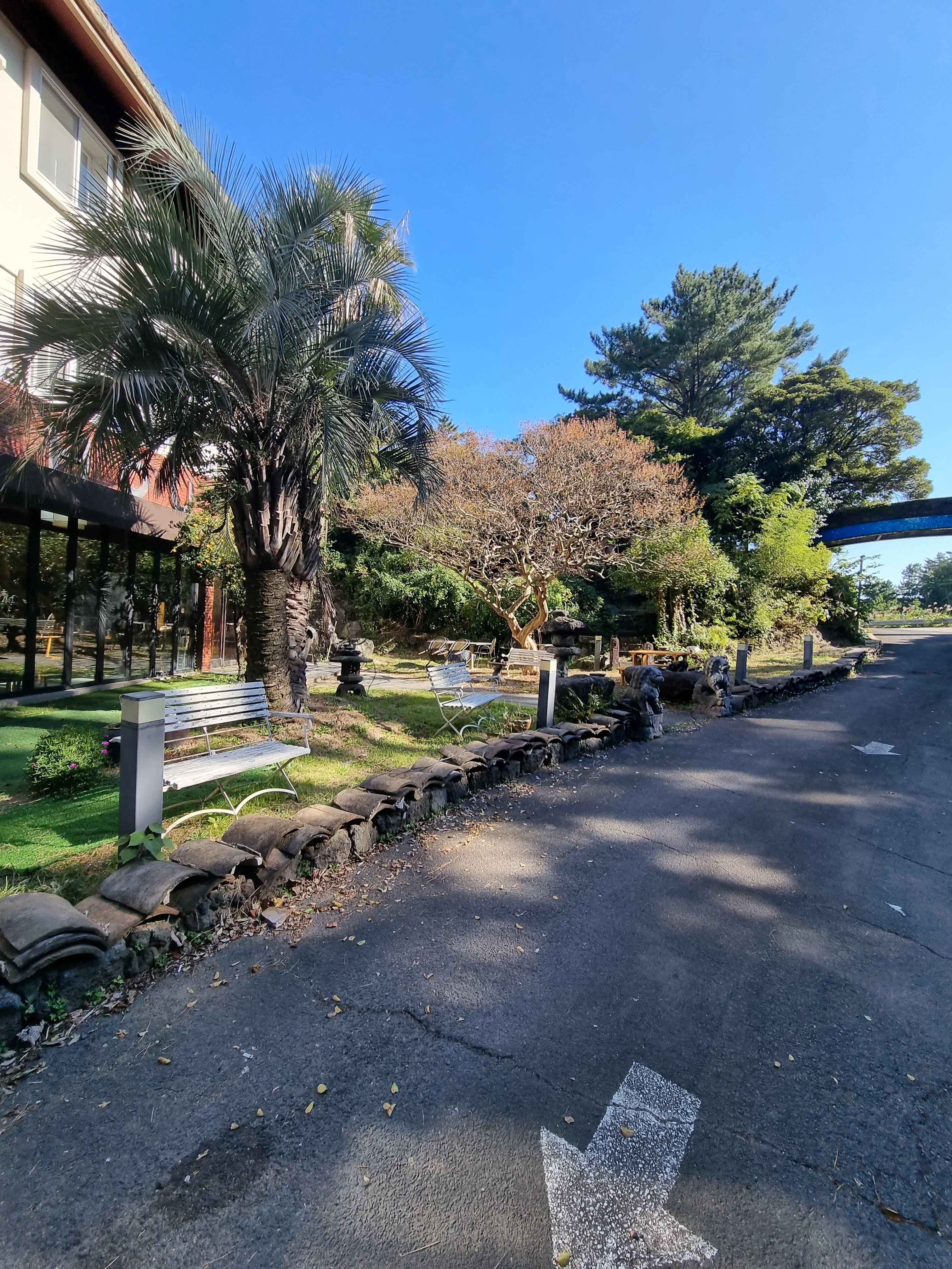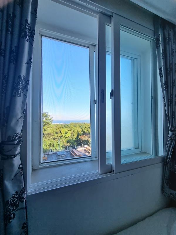 창문을 여니 제주다운 바람이 불어오고 청량한 새소리가 아침을 상쾌하게 한다. 창문 맞은편에는 바베큐장도 있다 .