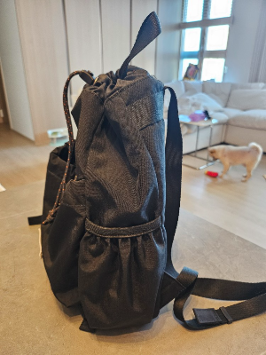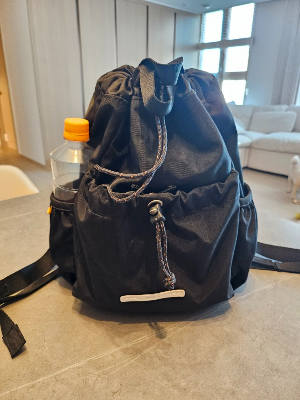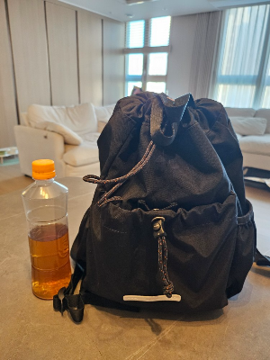 크기는 가방설명에 미니백팩이라고 했는데, 완전 미니미한 사이즈는 아니고.... 딱 성인여성이 부담없이 매일 들고 다니기 좋은 사이즈인 듯하다. 필수소지품(화장품파우치, 장지갑, 핸드폰, 차키, 노트등등)자잘한 잡동사니, 왠만한건 전부 들어가는데다, 양옆으로 500미리 생수나, 3단우산 넣을수 있도록 짱짱하게 늘어나는 사이드 포켓도 있어 유용하다. 사진처럼 500미리 생수병과 비교해 보면 부담스럽지 않은 크기인 걸 확인 할 수 있다. 그리고 경량소재라 가방자체가 가벼워서 더 좋다.