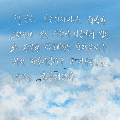 바꿔서 써봐야겠군.. 그런데 왜 청와대 고위직에 있는 사람이 신문기자에게 일급비밀을 알려주었을까? 의도적으로 중요한 정보를 언론에 흘려서 공론화?시키겠다는 수상한 목적?이 아닐까? 중요한 일급정보를 노출시켜서 그 고위관리자가 노리는 목적은? 계획된 의도라면 현정부에 좋은 감정이 아닌 반정부인사?? 상상의 나래를 펼쳐본다.
