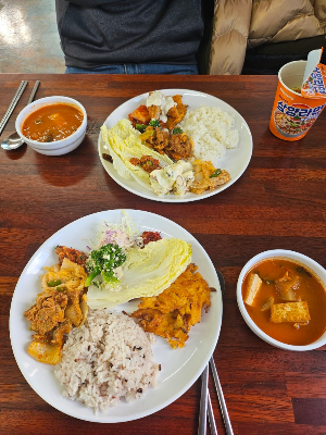 사진에서는 빠져 있지만 반찬들 가짓수가 꽤된다. 일단 한번 먹고 싶은 것 위주로 담아왔다. 기본반찬들,즉 젓갈류나 쌈채소류는 공통으로 매일 올라오는 것 같고, 메인 반찬들, 국이나 찌개는 매일 바뀌는 것 같고 생선도 옥돔,갈치구이가 나오고 오늘은 생선가스였는데 정말 다 맛있다! 특히 이때 먹은 김치찌개는 정말 집에서 한듯한 깊고 진한 맛이 짱! 울 엄니도 제주여행와서 이곳저곳 먹어보시다 이곳이 찐이다라고 인정한 곳.